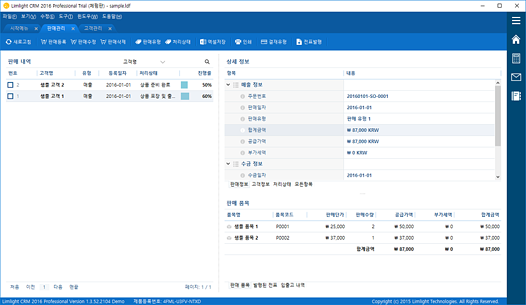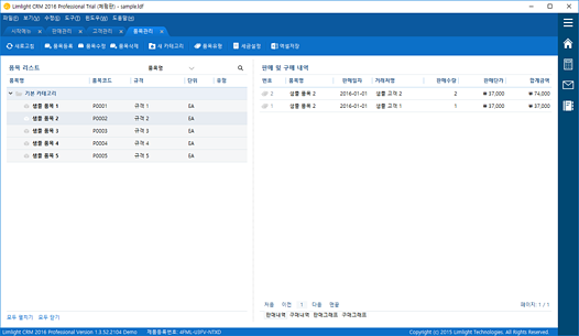 Limlight CRM 2016 는 자영업자 개인사업자 중소사업자를 위한 최적의 고객관리 판매관리 프로그램입니다 컴퓨터 업무에 익숙하지 않은 사용자를 위해서 직관적인 사용자 화면과 쉬운 사용법으로 구성되어 있습니다 Limlight CRM 2016는 프리미엄Premium 버전과 프로Professional 버전으로 나뉘어지며 고객관리와 판매관리가 필요한 일반적인 사용자의 경우 프리미엄 버전을 권장합니다 보다 다양한 기능을 원하시는 사용자의 경우 재고관리 와 회계관리 기능이 포함된 프로 버전을 권장합니다