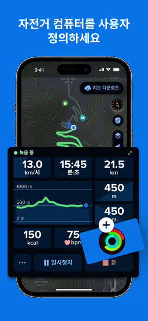 빠르고 쉽게 라이딩을 계획하고, 경로를 탐색하고, 추적하세요. 활발한 사이클링 커뮤니티를 통해 전 세계 수백만 개의 경로와 자전거 경로에 액세스할 수 있습니다.자전거 트래커 및 자전거 컴퓨터iPhone, iPad 또는 Apple Watch를 자전거 컴퓨터로 전환하세요. HealthKit 통합 포함.경로 플래너자전거 유형에 맞춰 주변 지역에서 완벽한 경로를 찾아보세요.루프 플래너시간이 많이 걸리는 수동 계획 없이 맞춤형 경로로 사이클링 경험을 향상하세요.BIKEMAP.NET더 자세한 계획을 세우고 싶다면 bikemap.net에서 경로를 앱과 동기화하여 즉시 추적 및 탐색을 시작할 수 있습니다.수백만 개의 자전거 경로내 지역과 전 세계에서 가장 인기 있는 루트, MTB 트레일, 자전거 도로를 확인하세요. 공식 경로를 포함합니다.표면 및 경로 유형 정보라이드를 시작하기 전에 경로에 대한 자세한 정보를 받아 정확히 무엇을 기대할 수 있는지 알아보세요.POI화장실, 레스토랑, 급수대, 전기 자전거 충전소 등 투어 중 중요한 장소를 찾아보세요. 커뮤니티의 실시간 보고를 통해 도로 공사, 포트홀, 미끄러운 도로를 피하세요.월간 및 연간 요약모든 자전거 활동의 월간 요약을 받아서 즐기고 자전거 동료와 공유하세요.통합앱을 Garmin과 연결하여 Bikemap 경로를 Garmin 장치로 보내거나, 외부 장치에서 Bikemap으로 동기화하세요.-- 바이크맵 프리미엄의 더 많은 기능 -- 이제 더 많은 기능이 제공됩니다.턴바이턴 내비게이션모든 경로에 대한 음성 내비게이션 안내를 받을 수 있습니다.셀프 가이드 내비게이션내 위치를 기반으로 경로를 따라가세요. 오프로드 구간에 적합합니다.오프라인 지도 및 경로오프라인에서 사용할 수 있도록 지도와 경로를 다운로드하세요.자전거 유형에 최적화된 경로로드 자전거, 산악 자전거 또는 시티 자전거에 맞게 내비게이션을 최적화하세요. 가급적 자전거 도로에서 탐색하세요.특별한 자전거 지도3D, 야간, 오픈사이클맵, 오픈스트리트맵, 위성, 아틀라스, 아웃