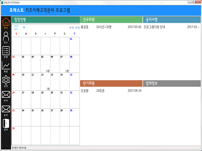 메인화면에서는 이달의 달력이 표시되며 일자별로 입장회원 집계와 금일 신규회원 및 만기회원목록이 표시됩니다
