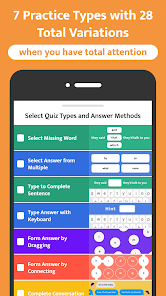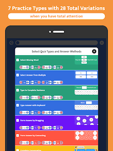 Practice with your favorite quiz types to master all words with a total of 24 different practice combinations