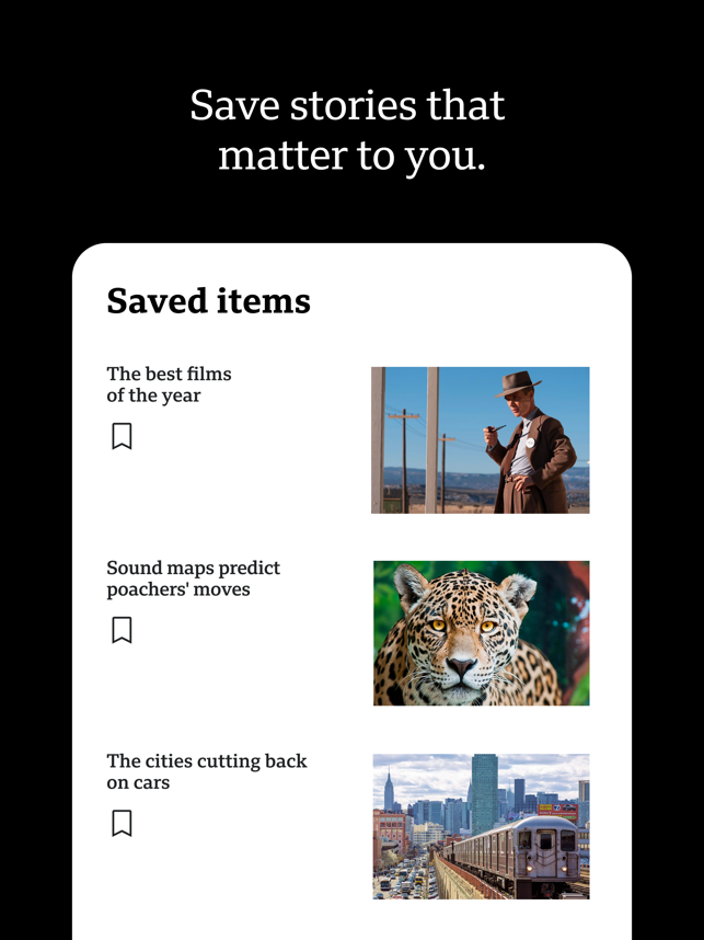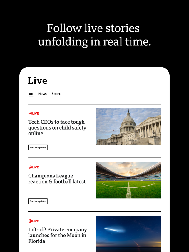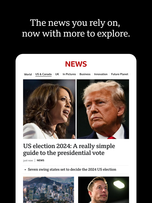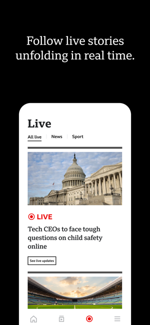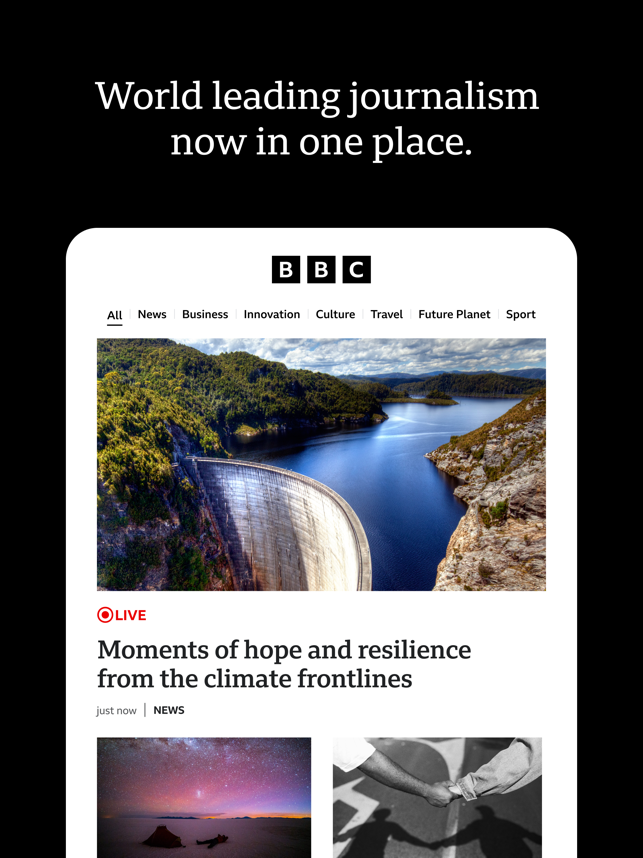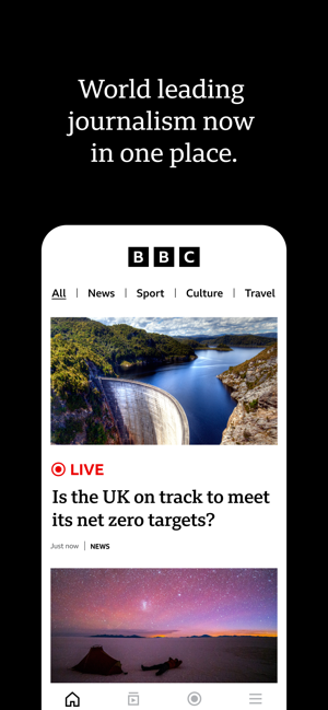THE BBC APP: News, stories, videos and live coverage from our trusted global network of journalists.BBC STORIES: The latest, breaking news headlines, articles and videos, including coverage of world News, UK News, elections, BBC Verify, and more. More stories and videos covering business, innovation, culture, travel, Earth, and much more.LIVE COVERAGE: Follow live news updates and live global sport in our Live section.BBC VIDEOS: Watch BBC News videos, BBC Sport videos, and video stories about climate, sustainability, science, health, technology, entertainment, and history.BREAKING NEWS ALERTS: Sign up for breaking news notification alerts from BBC News, delivered straight to your mobile device.FEATURES:• Log into your BBC Account to save articles and videos for later on the app and BBC.com• Watch videos over both cellular and wifi• Increase your font size for readability• Choose dark mode for a dark-background reading experience• Share stories and videos to social platforms like Faceb