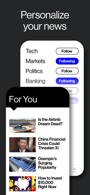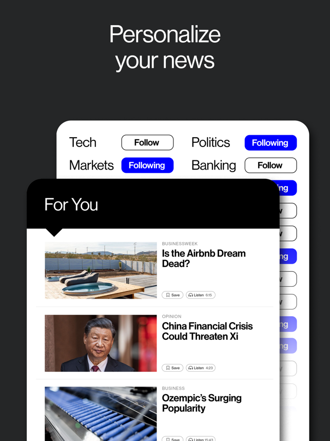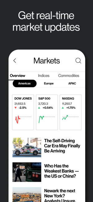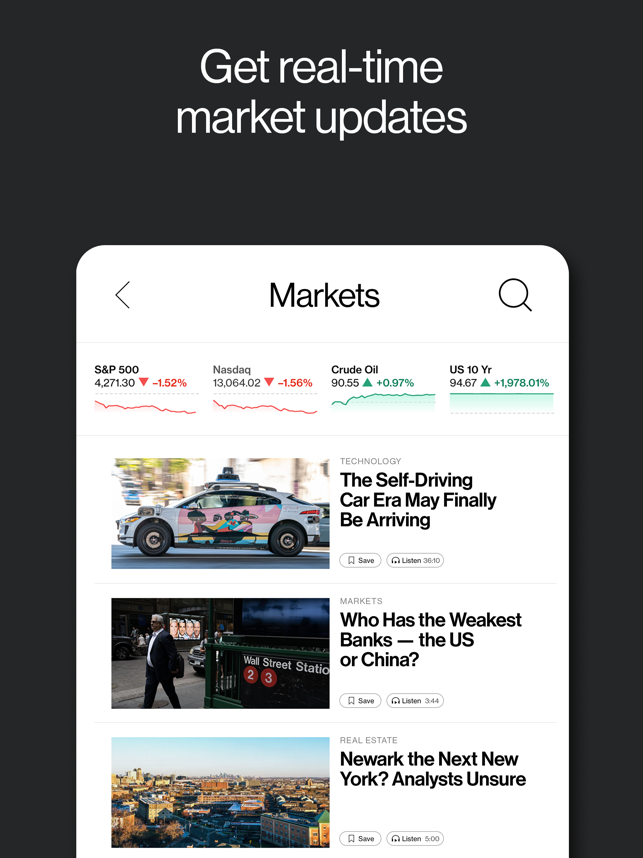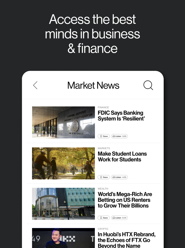 Breaking news on world finance, business, stock market and investments. Access award-winning journalism to help you understand the economics and financial news that’s shaping tomorrow, today.Before you change the world. Bloomberg.Customize the app to monitor the stock market and your investment portfolio. Stay up-to-date on trending topics like the US economy, oil prices, Dow Jones, NASDAQ and more.Bloomberg delivers critical business news for modern business leaders and financial professionals. Whether you need to monitor your stock portfolio, or understand the latest world news, Bloomberg provides data-driven insights and analysis, whenever and wherever you need it. FEATURES:- News: Browse featured and trending stories in Business, Markets, Industries, Technology, Politics, Foreign Affairs, Personal Finance, Opinion and more from our 120+ global newsrooms.- Market Data: Get the latest financial data to enable fundamental analysis, including stock prices, equity indexes, futures, bond
