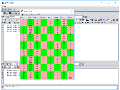 ASCII코드 보기2진 10진 16진 KSC5601 특수문자 삽입 기능 난수 발생 변환 기능Hexa 코드 URL 코드 Base64 코드 등이 있습니다
