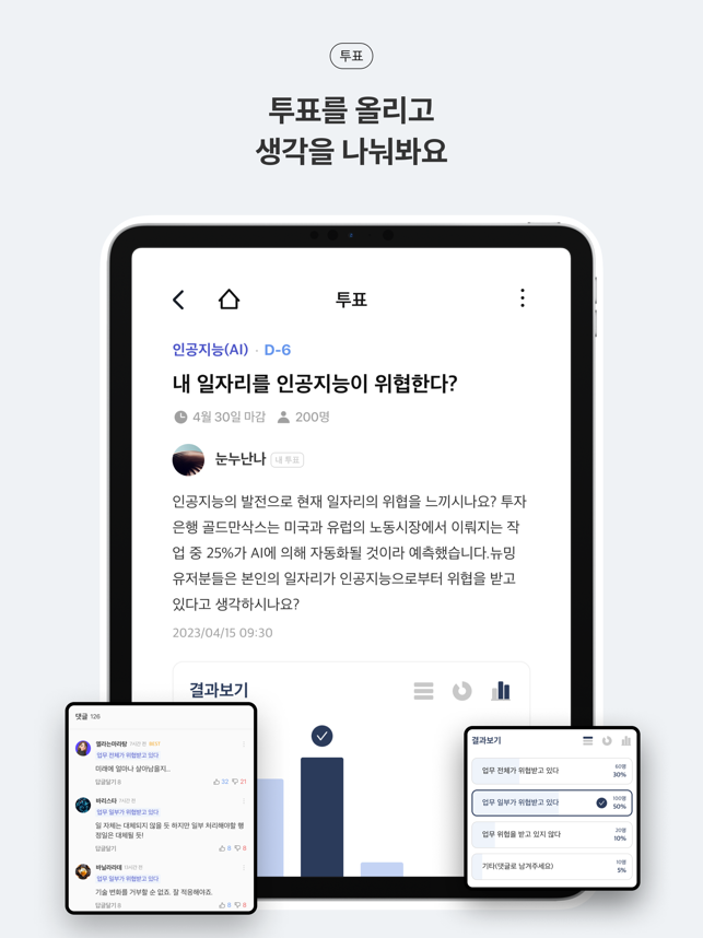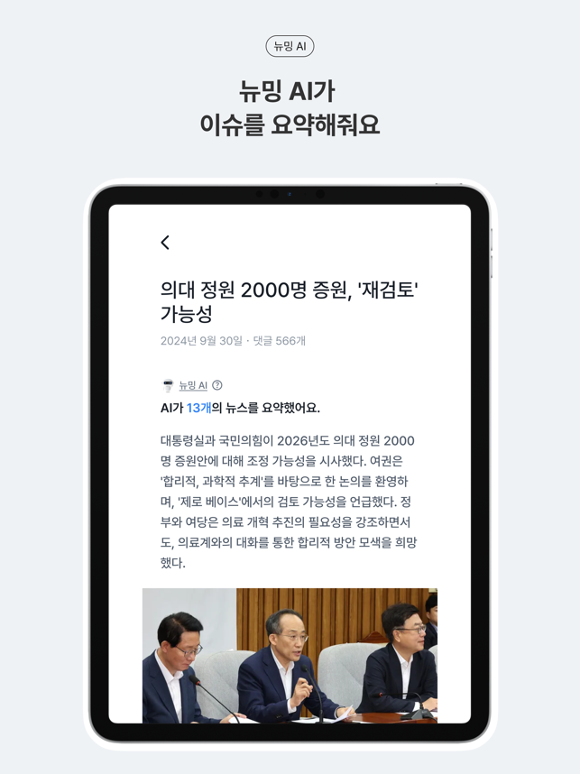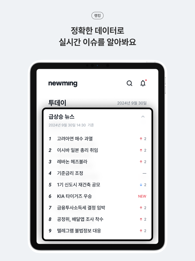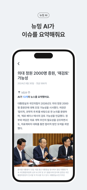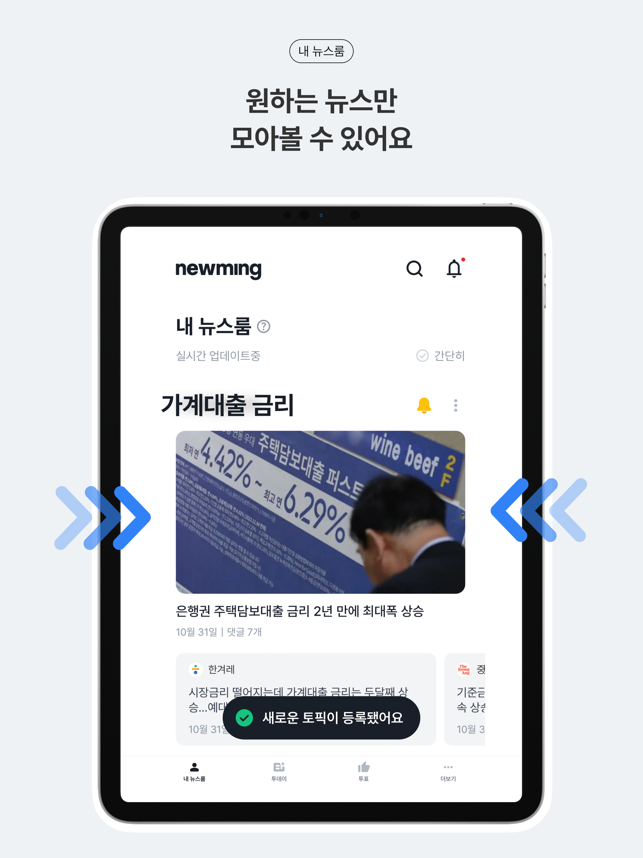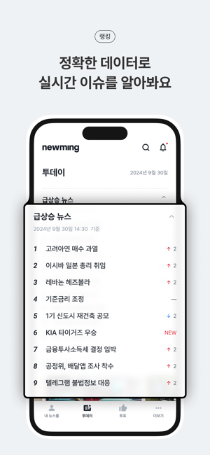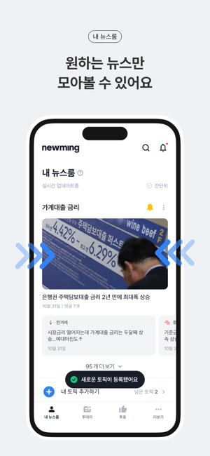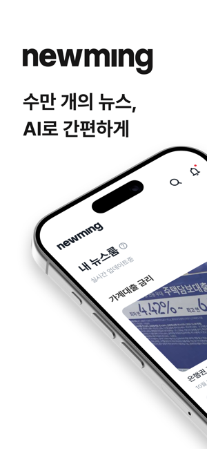 ● 댓글에서 시작되는 색다른 투표 경험• 사용자가 남긴 댓글을 바탕으로 새로운 투표 항목이 탄생하는 '다이나믹폴'• 뉴밍 AI는 댓글 속 중요한 의견을 찾아내어 실시간으로 '서브폴'을 만들어요.• 새롭게 생성된 항목들로 자신의 생각을 더욱 구체적으로 표현해 보세요.● 필요한 주제를 빠르게 찾는 스마트 큐레이션• 끝없이 쏟아지는 콘텐츠 중 꼭 확인해야 할 주제만 선별하고 있어요.• "오늘의 이슈"로 하루를 정리하고, "지금! 봐야할 뉴스"를 통해 소식을 놓치지 마세요.● 복잡한 기사, 간결한 요약으로 시작• 한눈에 파악할 수 있도록 정리해드려요.• 먼저 핵심 내용을 간략히 확인하고, 더 알고 싶다면 관련 기사를 직접 읽어보세요.● 맞춤형 콘텐츠로 개인화된 경험 제공• 관심 있는 주제를 등록하면 AI가 자동으로 연관 자료를 모아드려요.• 알림 기능으로 중요한 정보를 빠르게 받아보고, 나만의 뉴스룸을 만들어 보세요.● 콘텐츠 소비의 새로운 기준• 복잡한 과정 없이 간단하게 필요한 내용을 찾아보세요.• 뉴밍과 함께라면 매일 효율적으로 소식을 확인하고 관리할 수 있습니다.우리 이제, 뉴스를 간편하게 봐요.