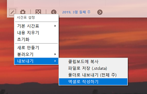쌤테이블은 다른 업무 환경에서도 마저 사용할 수 있도록 모든 주의 시간표를 폴더 안에 내보내어 불러올 수 있습니다 또한 엑셀에 자동으로 표를 만들어 똑같이 내용을 작성할 수 있는 기능도 탑재되어 만든 시간표를 출력하거나 다른 문서에 첨부하실 수도  있습니다