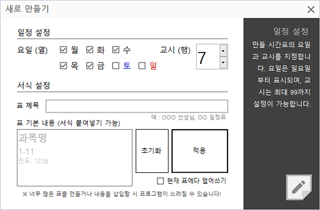 평소에 접할 수 있었던 주간 시간표의 형태를 그대로 반영하였기 때문에 처음 사용하는 사람도 실제 시간표를 사용하는 것처럼 익숙하게 활용이 가능합니다